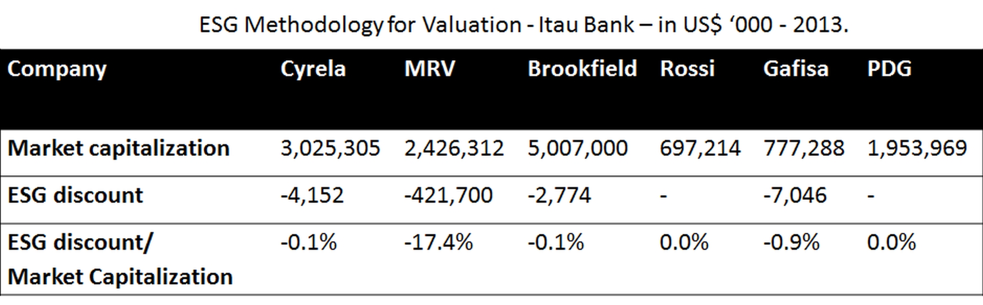 In a paper with Heiko Spitzeck we present the case of Itau, the largest private Brazilian bank that started using ESG factors to alter its portfolio allocation. Below is a table in which Itau analysts create an ESG discount for public companies in the real estate sector. It shows a steep discount for MRV, that made analysts change its weight in the portfolio of their particular fund.
