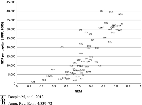 O mais importante, para a definição de políticas públicas, é que existe claramente uma correlação entre a existência de direitos reprodutivos e o desenvolvimento econômico. Ou seja, a liberdade de escolha de se formar ou não uma família por parte dos indivíduos, incluindo-se o direito ao aborto, é mais pronunciada em países mais ricos. O gráfico abaixo não deixa qualquer dúvida, existe uma forte correlação positiva (0.8) entre uma medida de legitimação de gêneros definida pelas Nações Unidas (GEM – gender empowerement measure) e renda per capita.