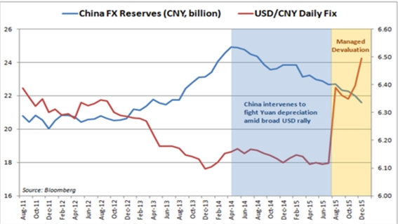 Capital outflows from China started to accelerate in April 2015. In August, China abruptly devalued its currency against the greenback, a move designed to stop the bleeding of capital outflows. Nevertheless, outflows continued to accelerate. About $170 billion left the Chinese economy in December alone — a clear sign of bets against the yuan pegged to the dollar. The move to a peg against a broader number of currencies did not help much, since the exchange rate is still determined daily by the People’s Bank of China (PBOC).
