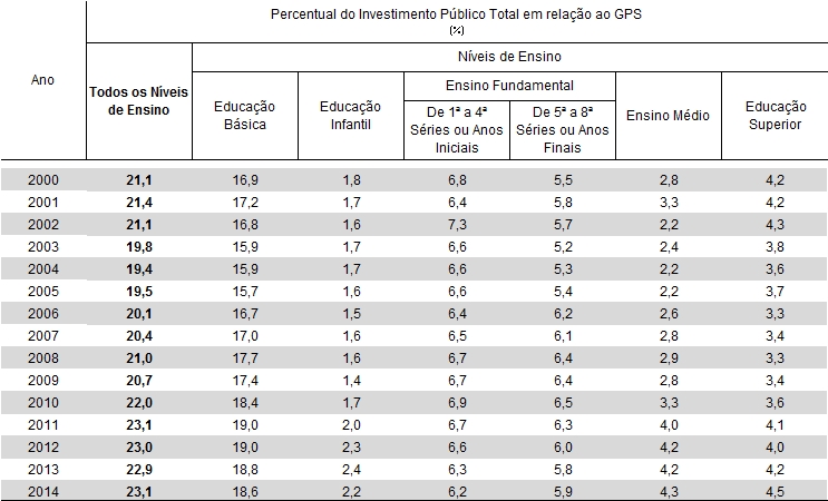 Primeiro, podemos ver que os investimentos em educação aumentam como proporção de todos os investimentos, de 2000 a 2014, saltando de 21% para 23%. Contudo, a maior parte do crescimento se dá no ensino médio e superior, que aumentam, em conjunto, de 7,2% do total de investimento em 2000 para 8,8% da proporção de investimento em 2014. Ou seja, 80% do aumento dos investimentos em educação foi consumido pela parte que gera menor retorno marginal para a sociedade. Ou seja, focamos, nos últimos 15 anos, no ensino médio e educação superior. Um erro grande que significa que perdemos a oportunidade de aumentar o nível educacional de toda uma geração, que não vai morrer de fome como na China, mas vai, com certeza, ter uma renda vitalícia muito abaixo do que poderia se tivesse recebido educação de qualidade. Afinal, o retorno de educação por um indivíduo é muito alta, tanto em países desenvolvidos como em desenvolvimento, o que é o grande leitmotif da ideia de que educação é a salvação do Brasil. Infelizmente, fica pior, como veremos no próximo post.