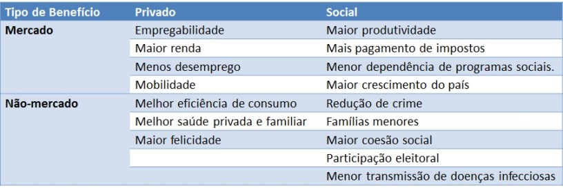 A questão de definição de políticas públicas depende primeiro do entendimento de como são distribuídos os retornos de educação, em termos de retornos sociais e privados. Ainda precisamos dividir os retornos em pecuniários e não-pecuniários. A ideia é simples, se o retorno de educação for basicamente privado e monetário, as pessoas deveriam buscar por si maiores investimentos em educação e, assim, o governo teria pouco papel na provisão de serviços públicos. É claro que a realidade mostra que, embora os retornos financeiros sejam altos, há uma série de retornos sociais da melhora do sistema educacional. Abaixo, um resumo dos retornos de aumento do nível educacional, divididos em mercado e não-mercado, e em retornos privados e sociais.