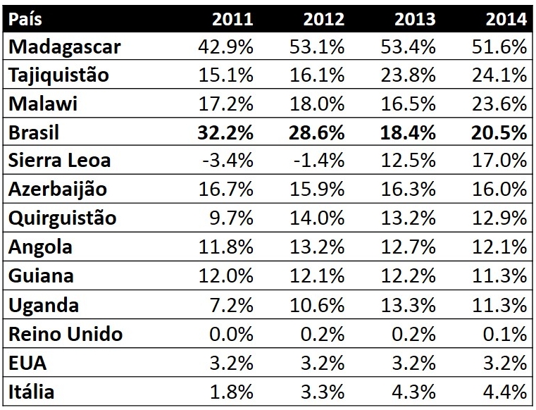 Diferença entre os juros bancários reais e a taxa básica de juros (SELIC, no Brasil). Fonte: Banco Mundial.