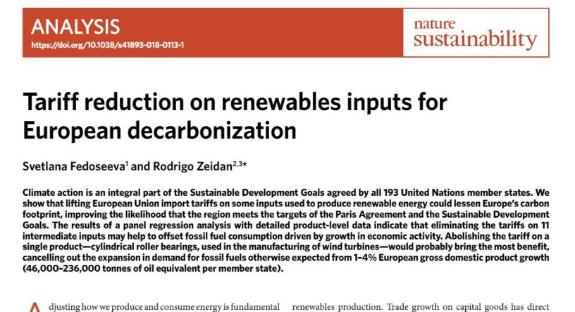 Climate action is an integral part of the Sustainable Development Goals agreed by all 193 United Nations member states. We show that lifting European Union import tariffs on some inputs used to produce renewable energy could lessen Europe’s carbon footprint, improving the likelihood that the region meets the targets of the Paris Agreement and the Sustainable Development Goals. The results of a panel regression analysis with detailed product-level data indicate that eliminating the tariffs on 11 intermediate inputs may help to offset fossil fuel consumption driven by growth in economic activity. Abolishing the tariff on a single product—cylindrical roller bearings, used in the manufacturing of wind turbines—would probably bring the most benefit, cancelling out the expansion in demand for fossil fuels otherwise expected from 1–4% European gross domestic product growth (46,000–236,000 tonnes of oil equivalent per member state).