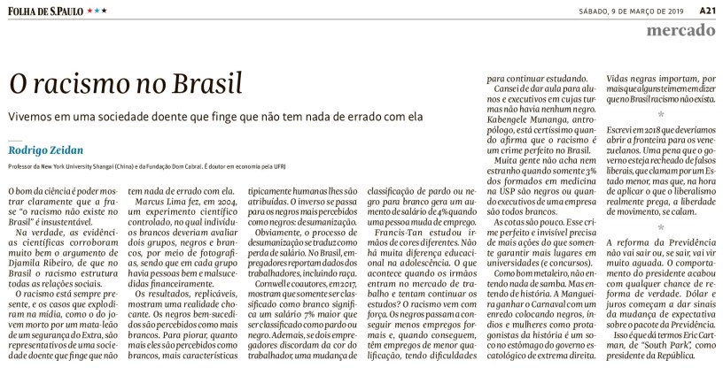 Quando vieram com o papo de que não existe racismo no Brasil, vocês podem responder: sim, existe, e aqui está a evidência científica. Qual é ela? Nesse artigo discuto evidências sobre racismo, a eficiência econômica das cotas raciais e porque esse tipo de cota e ações afirmativas que levam em conta etnia são preferíveis a critérios exclusivos de renda. No final do artigo, também mostro como o lugar comum sobre raça no Brasil é vazio de conteúdo, embora muito sedutor. “Somos todos humanos”, “trato todo mundo da mesma forma e por isso não reconheço raça”, e “cotas são racistas” são argumentos baseados em uma de duas opções: ignorância (que curamos com conhecimento) ou desonestidade intelectual (essa não dá pra resolver fácil). Mas antes disso, há evidência de que o Brasil é racista?