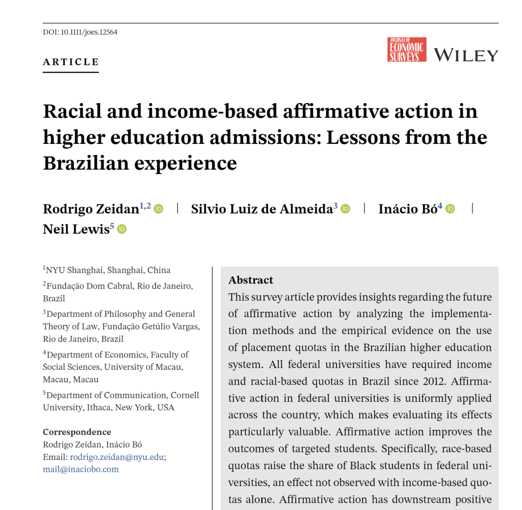 Here is the abstract for the published manuscript: “This survey article provides insights regarding the future of affirmative action by analyzing the implementation methods and the empirical evidence on the use of placement quotas in the Brazilian higher education system. All federal universities have required income and racial-based quotas in Brazil since 2012. Affirmative action in federal universities is uniformly applied across the country, which makes evaluating its effects particularly valuable. Affirmative action improves the outcomes of targeted students. Specifically, race-based quotas raise the share of Black students in federal universities, an effect not observed with income-based quotas alone. Affirmative action has downstream positive consequences for labor market outcomes. The results suggest that income and race-based quotas beneficiaries experience substantial long-term welfare benefits. There is no evidence of mismatching or negative consequences for targeted students’ peers.”